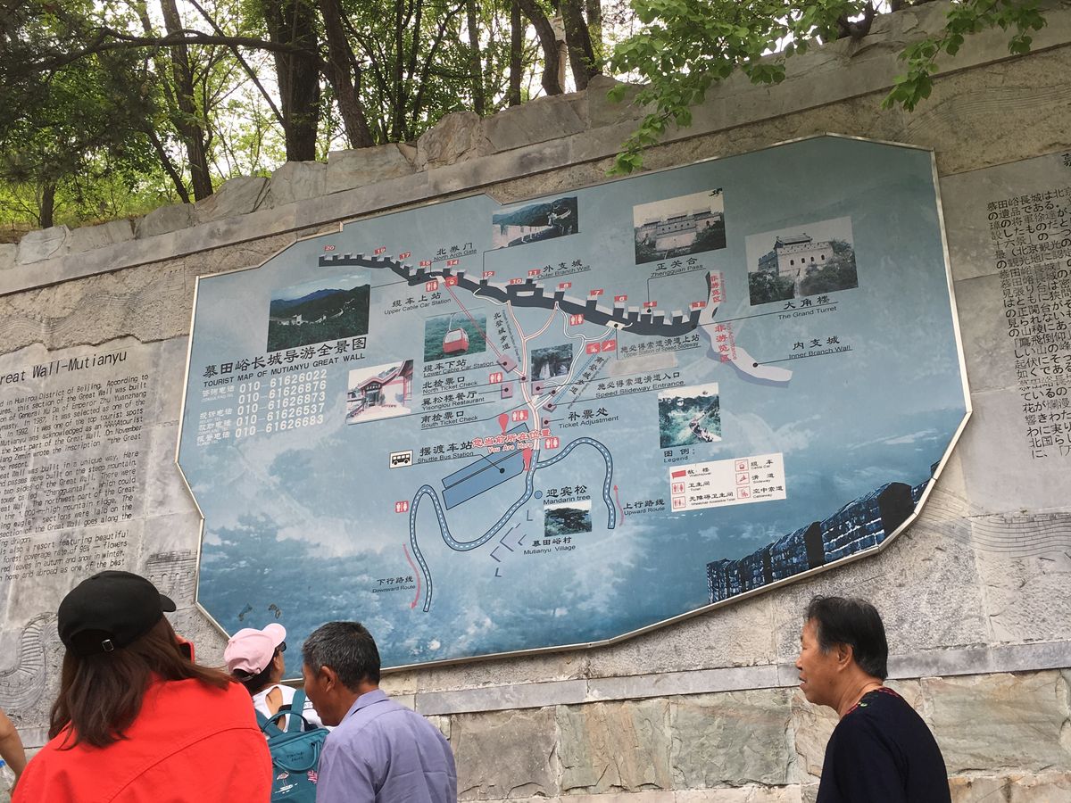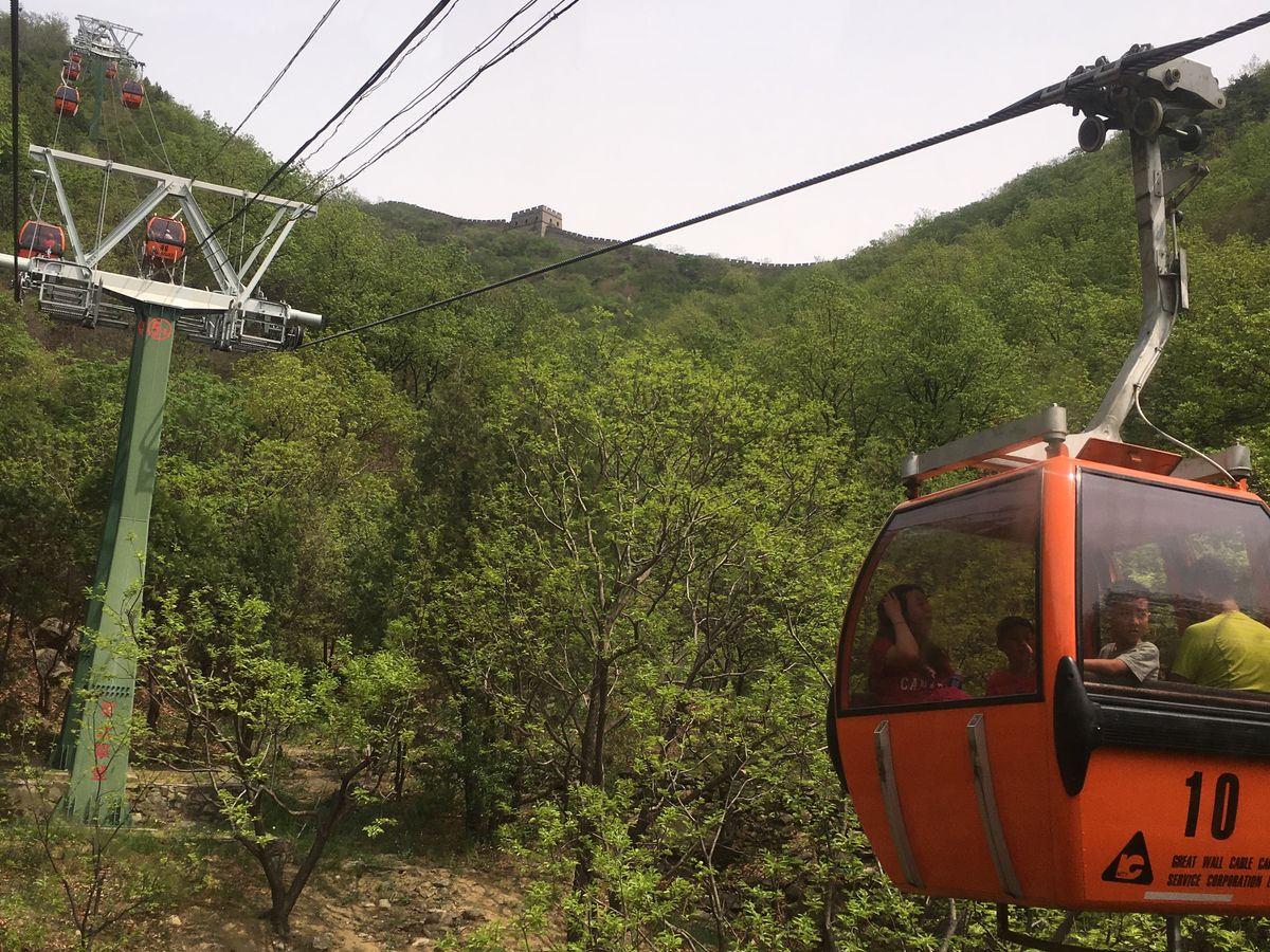 最初はホテル7:30出発でしたが、同ツアーの前日の混み具合をみて1時間早めて6:30にホテルを出発することに決めました。臨機応変な対応でした。おかげで道の渋滞はなく7:45には慕田峪の麓のセンターに着きました。それからは、ロープウェイとシャトルバスのチケットを購入する行列(その間に家族は長蛇の列の女子トイレにアタック)、シャトルバスにのるための列、ロープウェイに乗るための列、に実に3時間かかっていました。さすがGW連休、混んでます。混んでる時こそガイドツアーにして本当に助かりました。ありがとうございました。