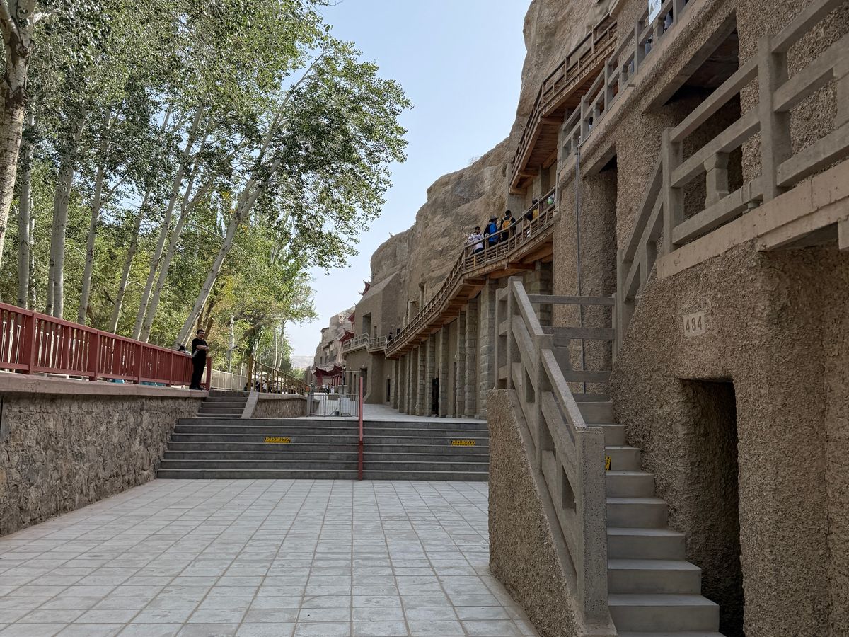 莫高窟は1400年前から1000年かけて拡張されたそうで、長い年月が経っているので改修は仕方ないですが、岩山の表面の雰囲気と下の方の改修された部分が少しミスマッチ。