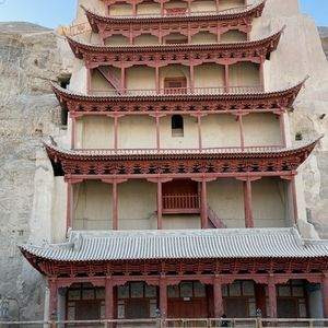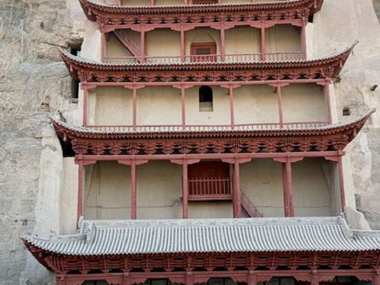 莫高窟は1400年前から1000年かけて拡張されたそうで、長い年月が経っているので改修は仕方ないですが、岩山の表面の雰囲気と下の方の改修された部分が少しミスマッチ。