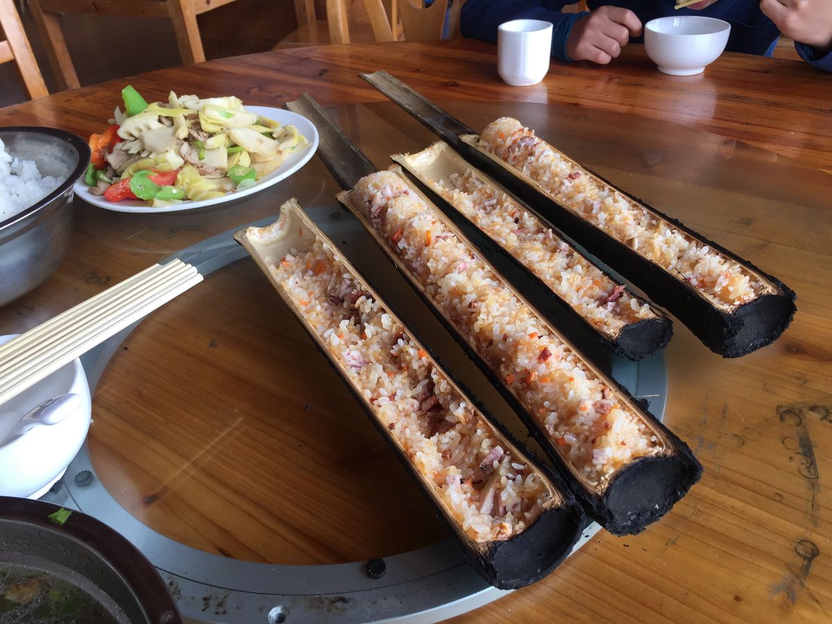 チワン族の郷土料理は、日本人の口にも合う味付けで、特に竹筒で炊いたおこわは最高でした。