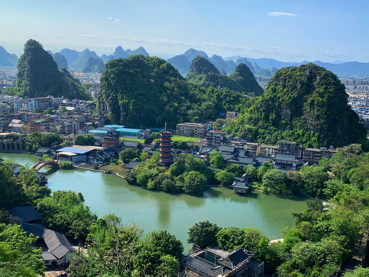 次に訪れたのが、桂林を一望する畳彩山。手軽に登れる展望台として観光客にも地元の人にも人気ですが、頂上からの眺望は絶景です!カルスト台地の地形に街が広がり、世界でここにしかない景色をつくりだしています。絶景を見ながら頂上で食べたアイスクリームが美味しかったです(頂上の売店で売っています)。
