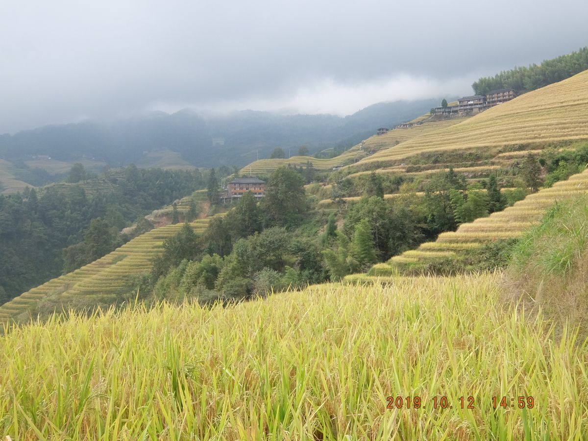 いつ棚田を刈り取るか不明だったので、桂林到着後すぐに参加できる日を、日本語のツアーは高いので英語のツアーを申し込んだ。参加者は、ベラルーシュの若者、オランダ人の若夫婦。香港からの老夫婦と我々と7人。英語のツアーにしたのは結果的に正解でした。香港の老夫婦は当然ながら中国語は喋れるので食事の時にウェイターに取り皿など色々依頼してくれた。ベラルーシュはほとんど知らなかったが、少しの知識を得ることができた。最初はみんなロープウエイで登る予定だったが、着いたらロープウエイが混雑しているから、歩いて登ってくれないかとガイドさんから提案があり、香港の老夫婦を除いて、登山することになった。30歳代の若い人々と一緒に上るのはかなりきつかったが、棚田を見ることに関しては、徒歩で登るのは大正解。登っていく途中で、いろんな角度から素晴らしい棚田を見ることができた。