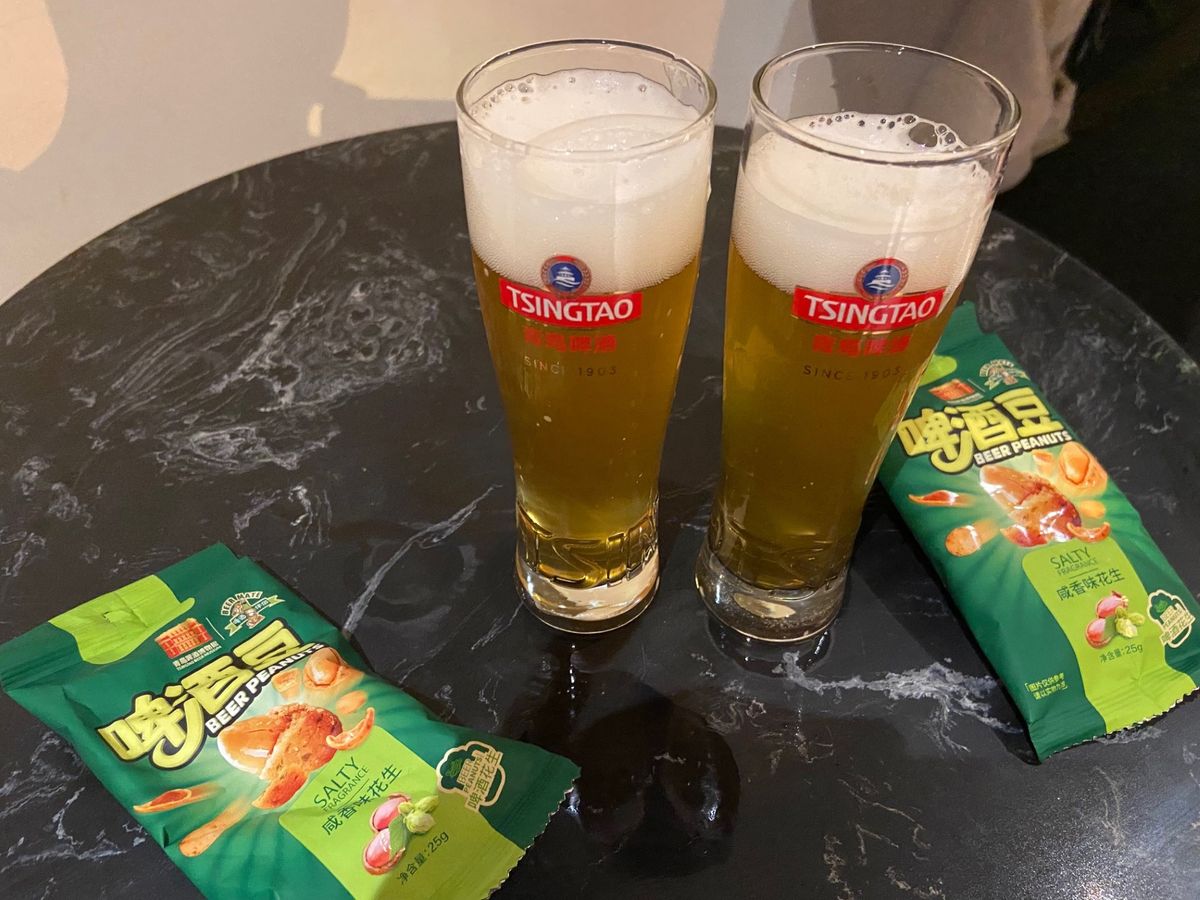 街中のいたるところで生ビールを売ってて、ビニール袋に生ビールを入れて売っている屋台もあります。ドイツのような美しい街並みで、青島ビールを堪能しました。