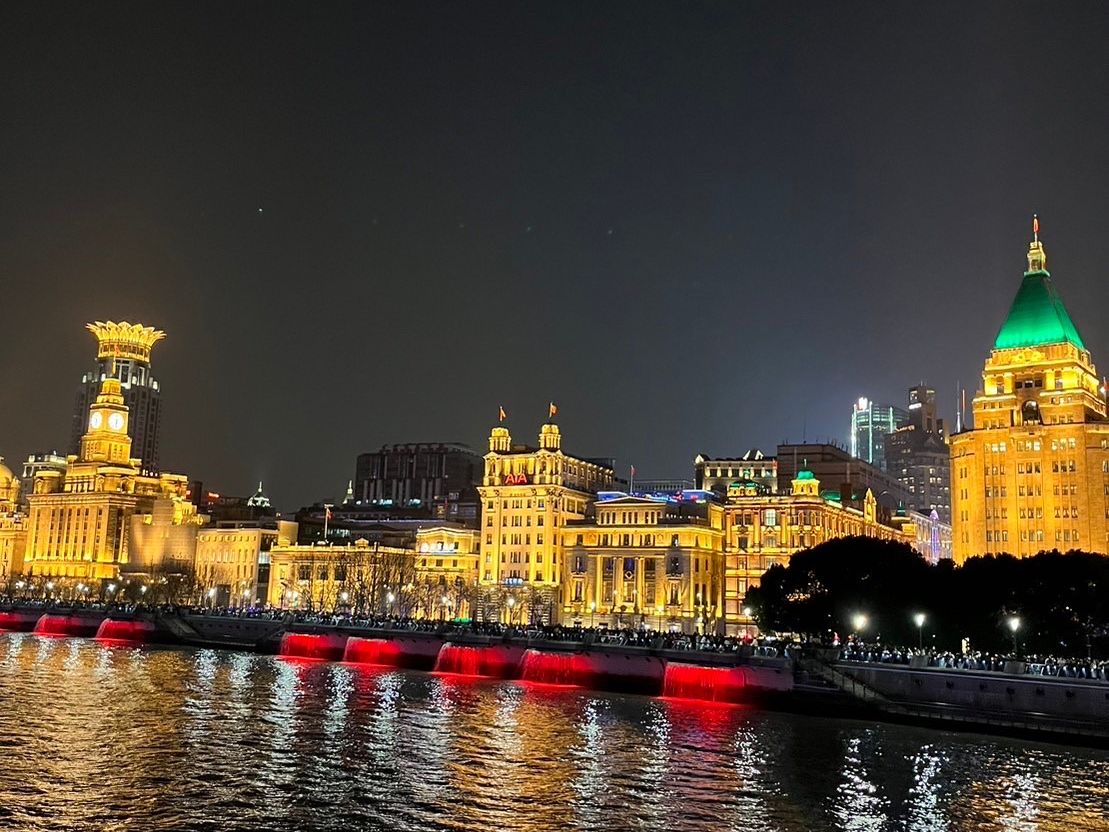 黄浦江の東側には高層ビルや東方明珠塔の近代的な夜景が、西側には歴史的な建築物が臨めます。あまりの美しさであっという間の45分でした。