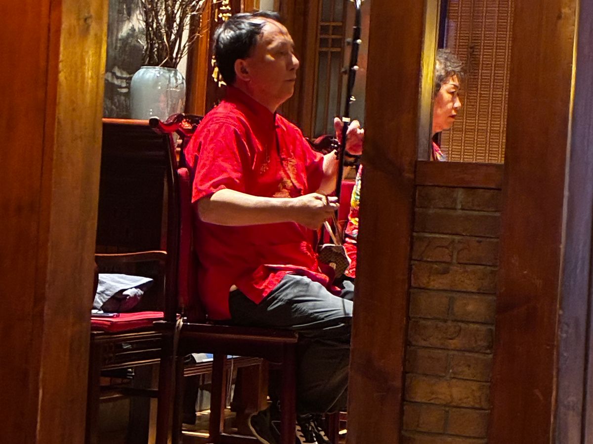 料理もおいしく、二胡の演奏も素敵なのですが、ガイドも個室の端に座るのが気になります。