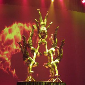 器械体操系や軟体人間、超絶バランスといった定番のものから、妖艶でうっとりする女性の演技、帽子かぶり(コメディ的な)芸や手から次々にトランプを出すマジック的なものなど幅広い演目で飽きることがなかった。規格外で圧巻の演技だろうと想像してはいたが、それ以上で感動に近いものを感じました。私は2列目で見ましたが、本当に買ってよかったという気持ちで絶対におすすめです。駅からは少しだけ歩くので、時間に余裕を見て集合することを勧めます。