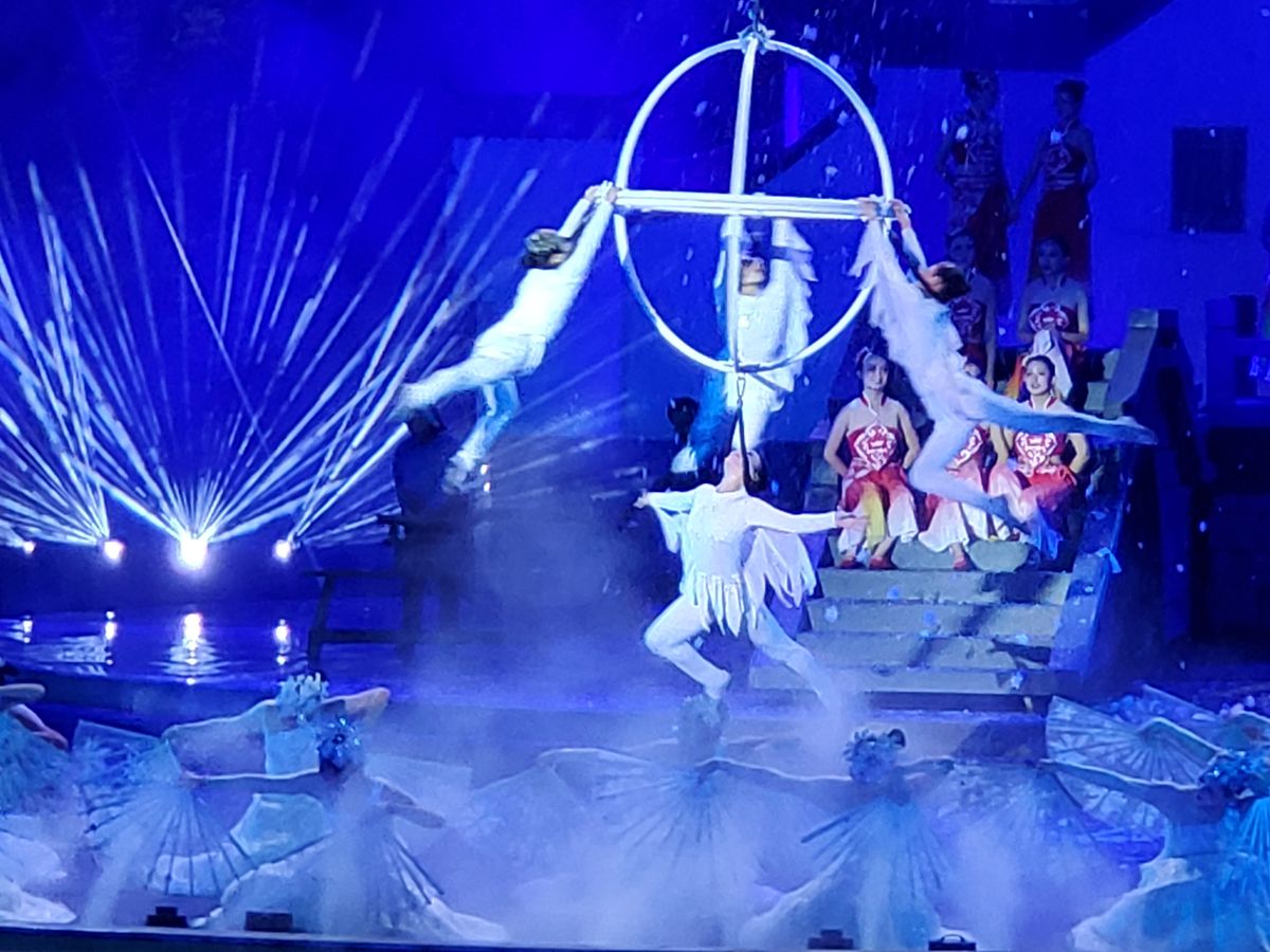 水上ショーはかなり多い出演者数で、美しく迫力がありました。中国語でしゃべっているところは内容が分からなかったけど、英語の字幕が出て「今の場面は秋」といったことは分かりました。言葉はほとんどないので外国の人も十分楽しめます。屋外だけど屋根があり、写真や動画撮影は自由です。