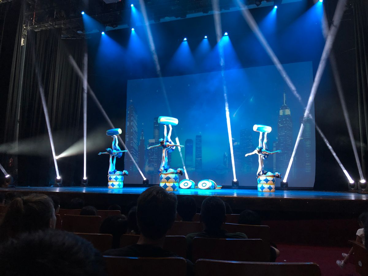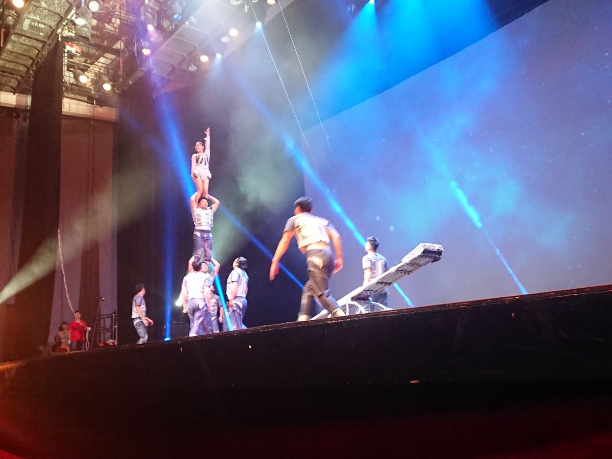 舞台が広くないかわりに客席との距離が近く、大迫力で楽しめました。特に前方2列目中央の席だったため、演者の筋肉のうねりがよく判るほどでした。命綱なしのアクロバットな技の連続で、手に汗握りました。雑技だけではなく、手品やお笑い、客席いじりもあって、1時間半があっという間に過ぎました。また、会場のB1Fには高級スーパーがあり、早めに会場に行ってスーパーを探索することもお勧めです。