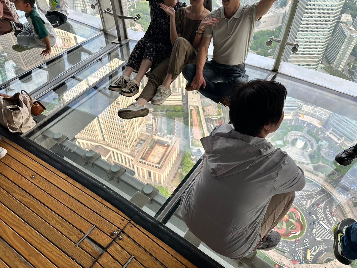 エレベーターに乗ってまずは二球へ行きます。遥か遠くまで続く上海の街並みを見渡せて満足です。エレベーターホールから1フロア降りたところは床がシースルーになっている展望台があります。高所恐怖症でない自分でも少し怖かったです。