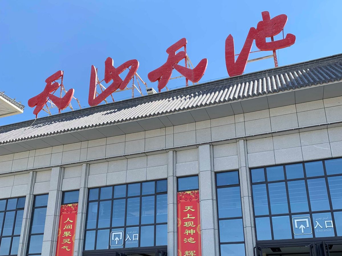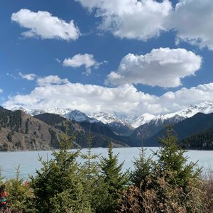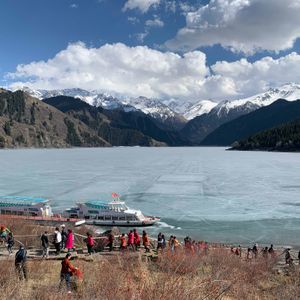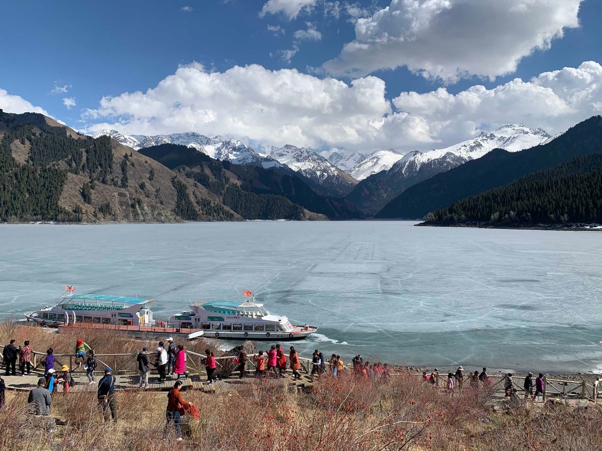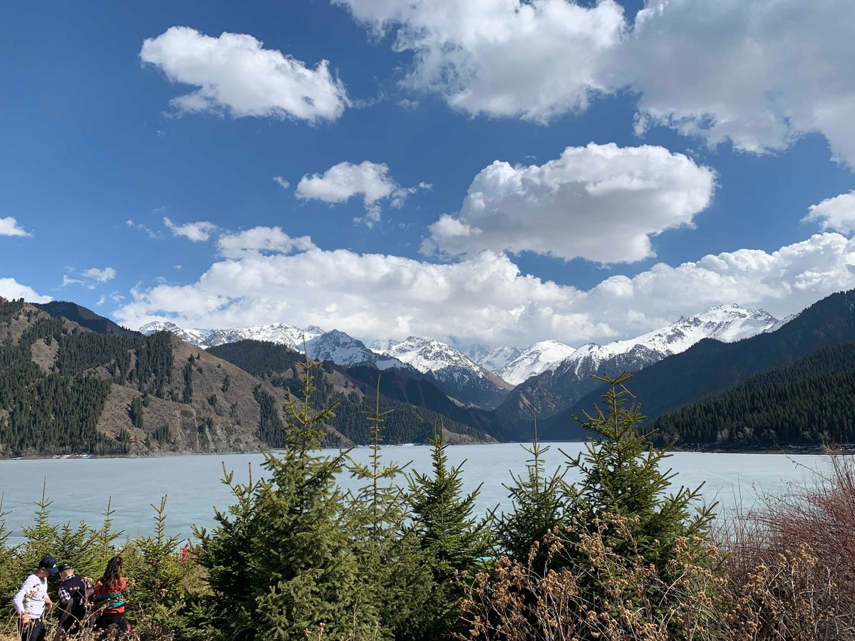 世界遺産の天山天池は、中国人観光客に人気ということでたくさんの観光客が来ていました。天池までは駐車場から専用シャトルバスで約30分。いろは坂も顔負けの凄い道路をバスで上っていきます。シャトルバスを降りたら、天池までは徒歩10分。この日の気温は18度くらいで上着は要らず、長袖のシャツで気持ちが良い気候でした。天池(湖)に着いてみると、湖面がまだ凍っており、不思議な感じです。美しい天池のバックには氷河をたたえた4000m~5000m級の天山山脈が広がり、まさに別世界の景色です。この山脈を超えてシルクロードで様々なものが伝来したと思うと、更に感動です。