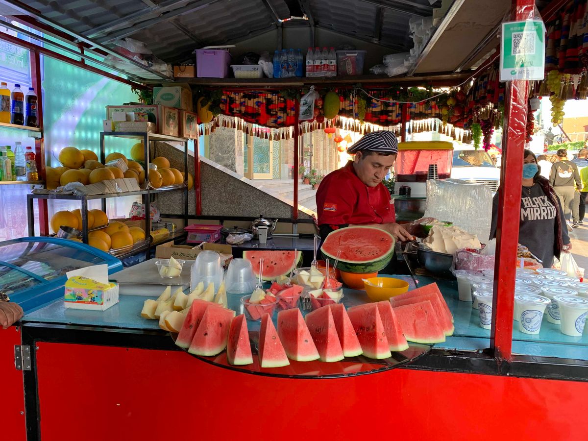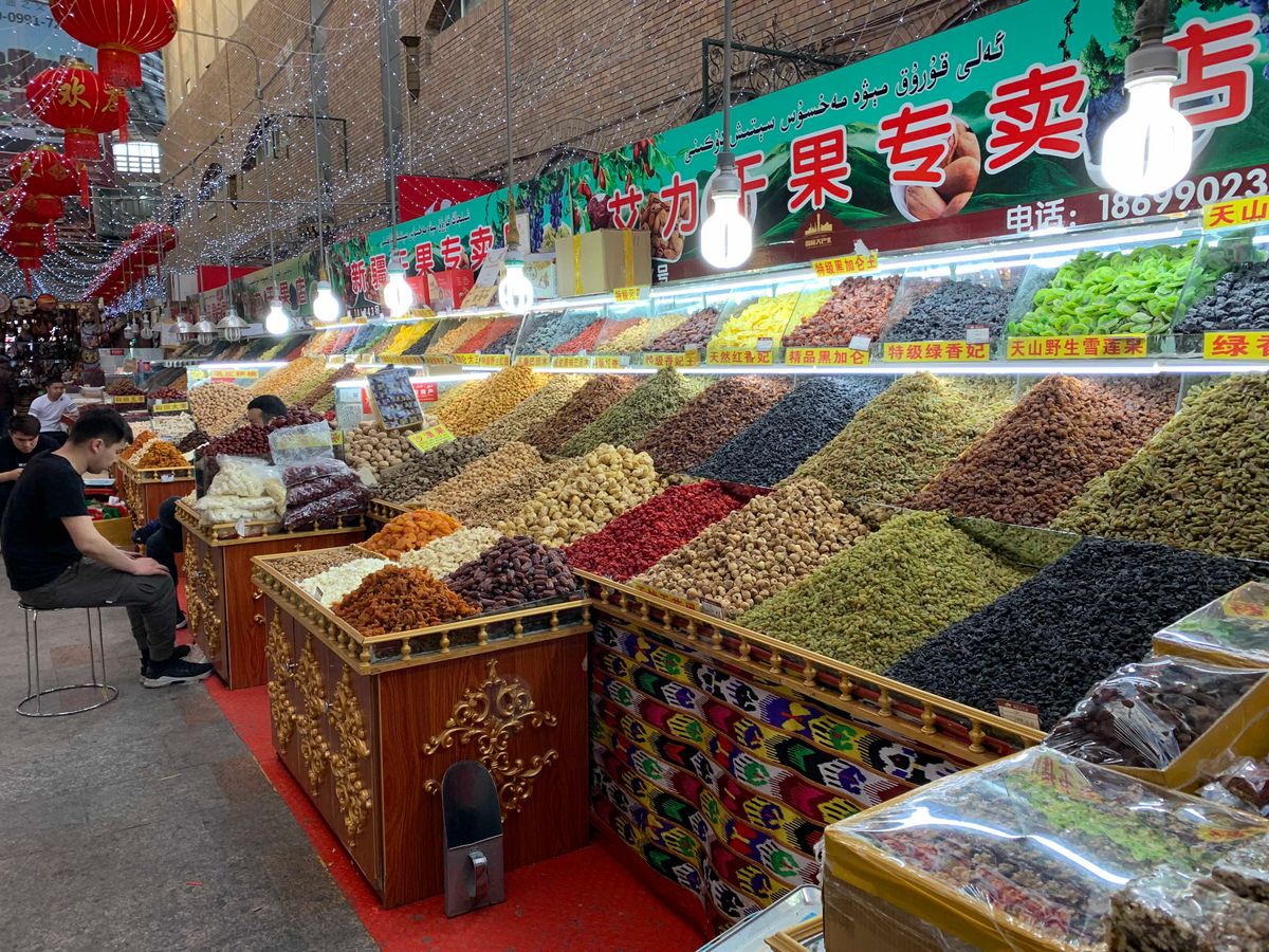 二道橋国際バザールは、かなり楽しいです!観光客用といった感じですが、屋台や出店を巡りながら何時間でもいれます。晩ご飯のことを考えてシシカバブ(羊肉の串焼き)の屋台は泣く泣く通り過ぎましたが、果物の屋台でスイカとハミウリ(メロンみたいな形と味の黄色の瓜)を食べました。何でこんなに美味しいんだろう!日本の果物のような不自然な甘さではなく、ウルムチの気候に合う爽やかな甘さです。名物のドライフルーツのお店には相当な数の種類のドライフルーツが並びます。まとめて買って、小分けにすればお土産にぴったりです。