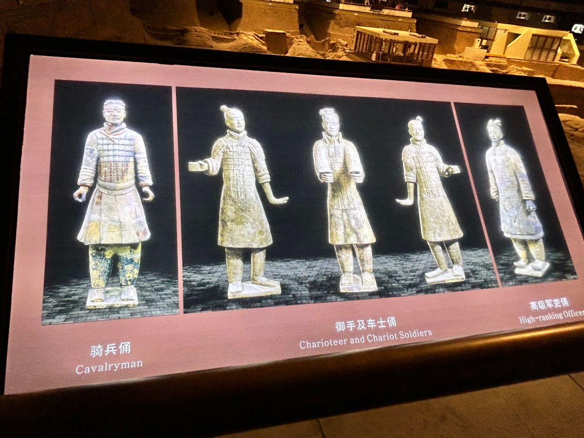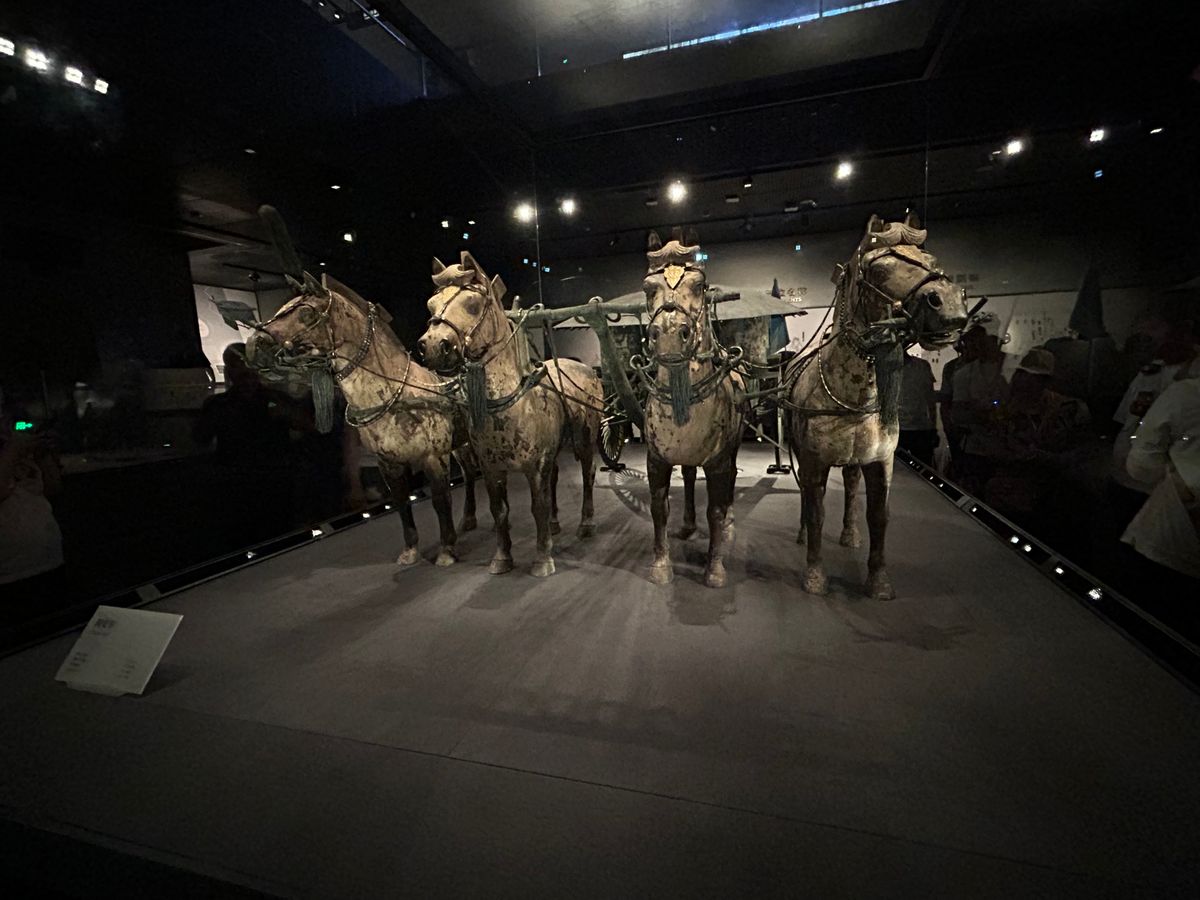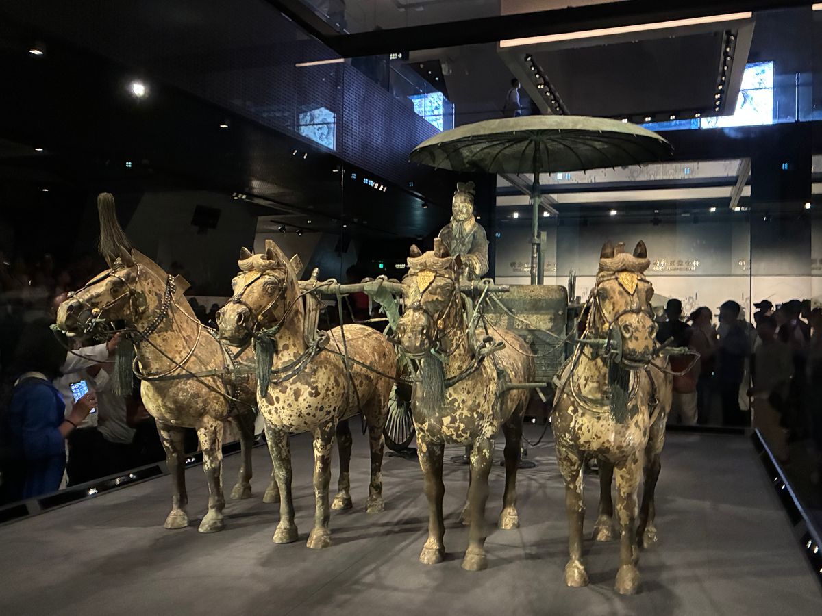 秦の始皇帝陵では銅馬車を360℃からしっかり見ることができ、この他の副葬品もしっかり見学できました。敷地が広くカート車移動のため、昼食や夕方のフライトを考えて短縮ルートで案内してもらいました。何度かカート移動があるのですが、ここでも李さんがすり抜けていくので時間短縮できました。