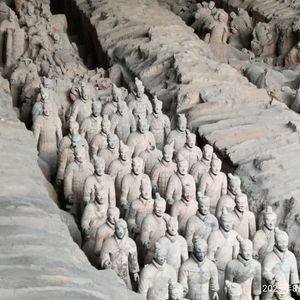 「20世紀最大の発見」といわれる兵馬俑は約2,200年前始皇帝を永遠に守るために副葬されたものです。西約210m、南北約60mの広大な広さのところに、兵士と馬の実物大の陶器が並べられ、陶俑・陶馬の総計は8,000体以上と推定されています。秦の始皇帝陵の一部として1987年、世界遺産(文化遺産)に登録されています。