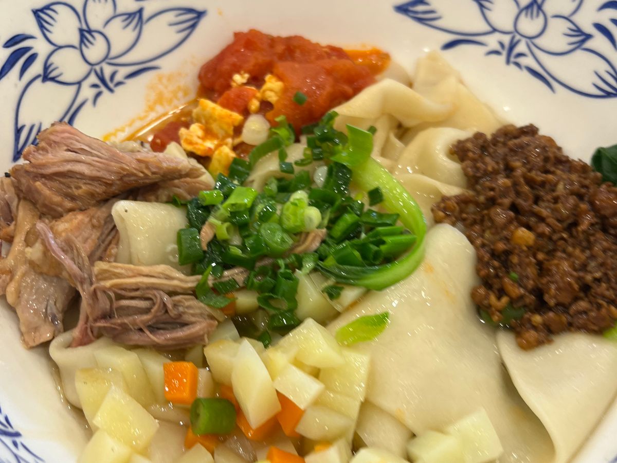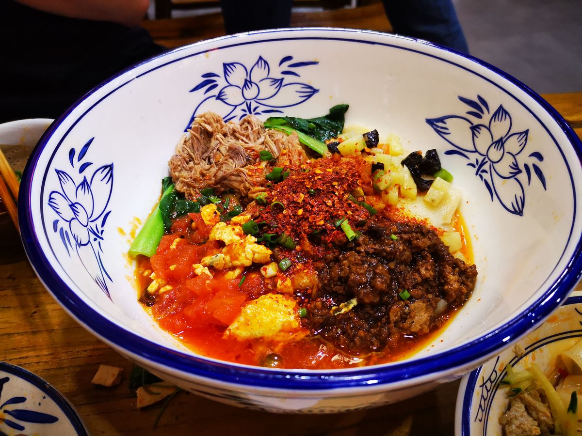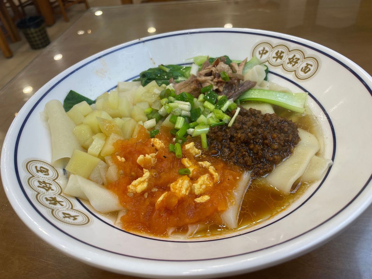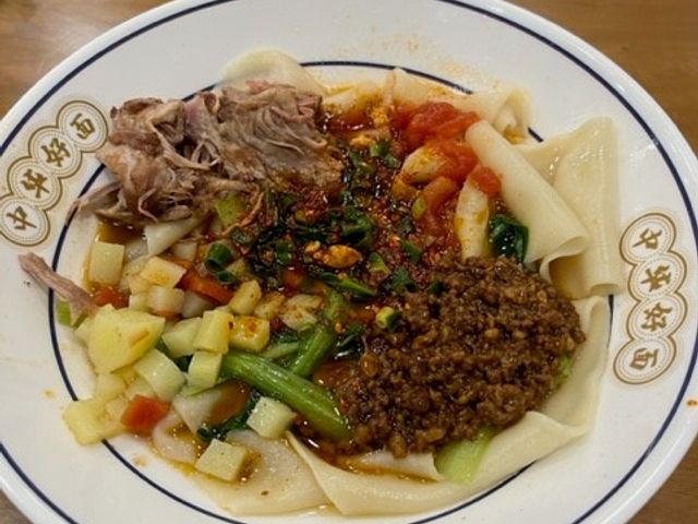 昼食はビャンビャン麺。辛さ(辣)は控えめにするのがオススメです。気になる方はペットボトルや消毒を持参して器を消毒すると良いです。