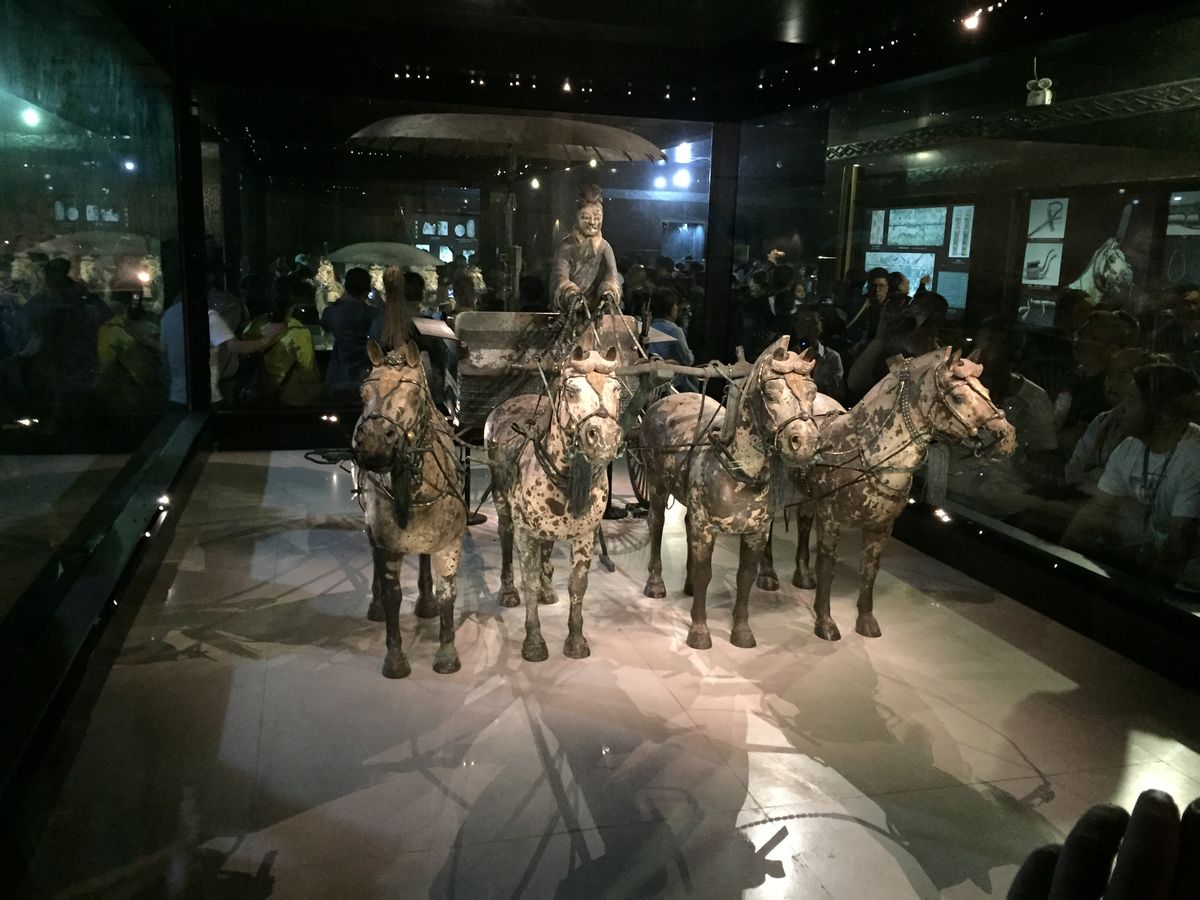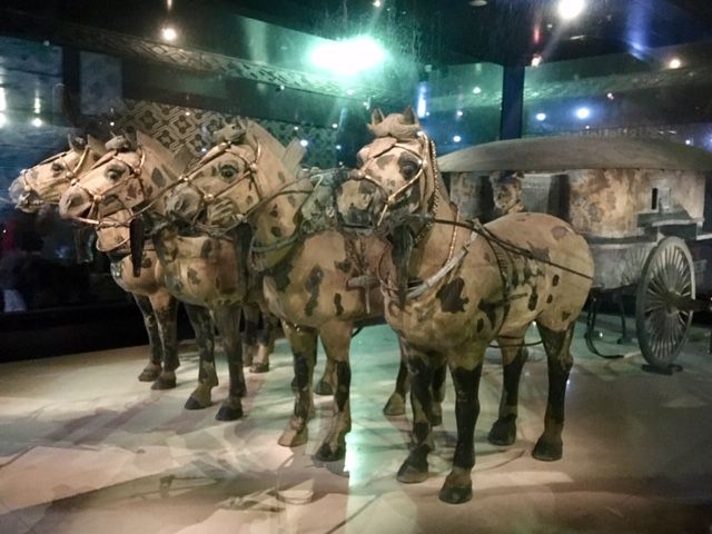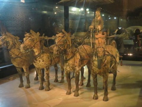 次に兵馬俑館を訪問しました。ここは1、2、3号坑及び馬車青銅博物館に分かれており、順番に回ることになっていましたが、VIPの訪問があり2号坑が一時的に閉鎖になっておりました。そこでガイドさんの機転で3号坑、場所青銅博物館を先に見学し、2号坑を最後に回ることにしました。この機転がなければそれぞれの場所で待機することになり見学時間が大きくオーバーすることになったと思います。1号坑のスケールの大きさも感嘆に値しますが、2号坑の兵士俑及び青銅の馬車は近くで見ることが出来、紀元前にこのような詳細なものが作成されていたと言うことで、その文明のレベルの高さに驚きました。この青銅の馬車は現在の技術でも作成出来ないようです。(事前に読んだ本によると、特に異金属間の溶接技術が非常に高い)