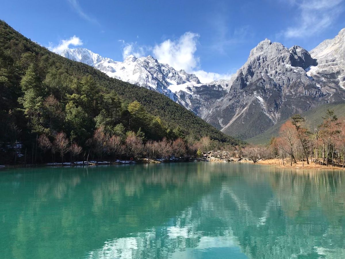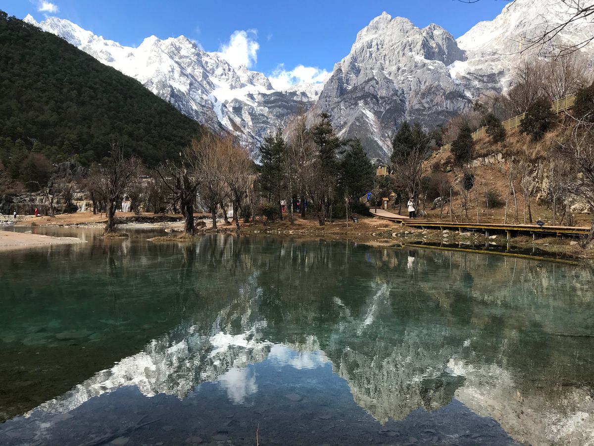 玉龍雪山の雲杉坪へは中国人の団体客が来る少し前に登れたので、ゆっくりと景色を楽しむことができました。お天気もよく、雪山がくっきりと間近に見れて本当にきれいでした。白水河もエメラルドグリーンに輝いていて、周りの景色が水面に映っている様子が素晴らしかったです。