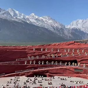 その後、数百人での丽江ショーも晴れていれば、壮大な山々をバックにした壮大なショーだったと思いますが、天気はどうしようもないですね。中国でネットに出ていた写真を添付します。