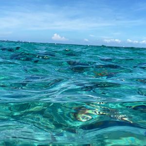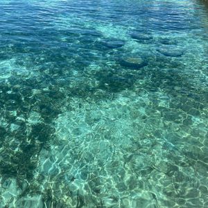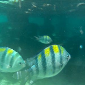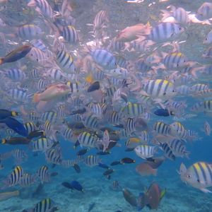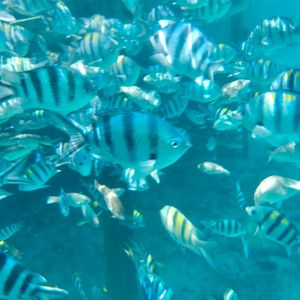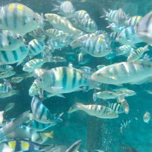 海はとても透明度が高かったです。餌付け用のお菓子がもらえます。カラフルなお魚がツンツンと寄ってきて、いつの間にか視界いっぱいのお魚に囲まれて楽しかったです。