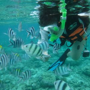 ヒルトゥガン島でのシュノーケリングでは、現地のインストラクターの方が親切にサポートしてくださり、浮き輪を引っ張って魚がいるポイントへ案内してくれました。そのおかげで、泳ぎに自信のない私でも安心して海中の世界を楽しむことができました。水中では、色とりどりの魚たちが目の前を泳ぎ回り、まるで自分が水族館の中にいるかのような錯覚を覚えました。特に、大きな魚の群れの中に入ったときは、自分もその一員になったような不思議な感覚を味わい、自然の偉大さと美しさに心から感動しました。