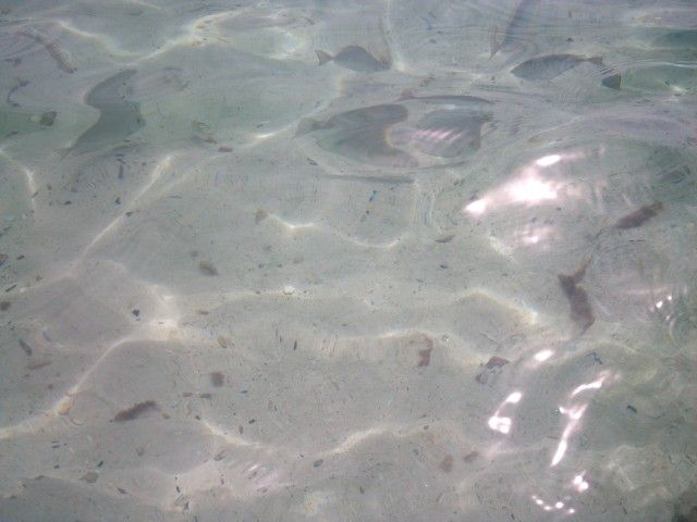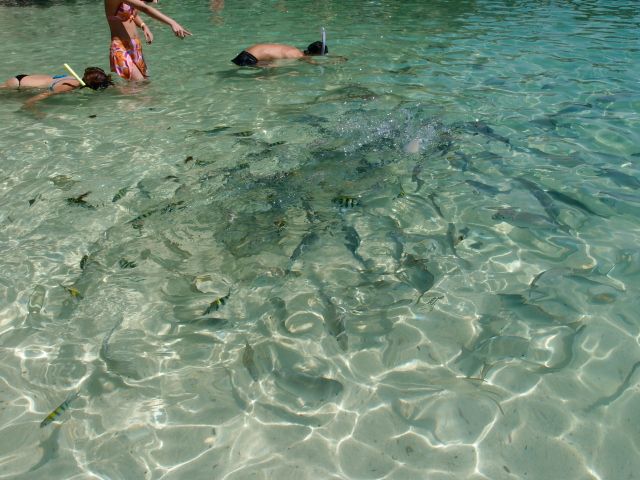 餌付けされているのか、現地の人がえさをまくと魚がたくさん集まってきます。かなり砂浜のほうまで魚が来るので小さい子供でも十分に見ることができました。