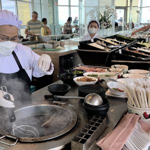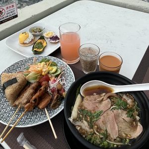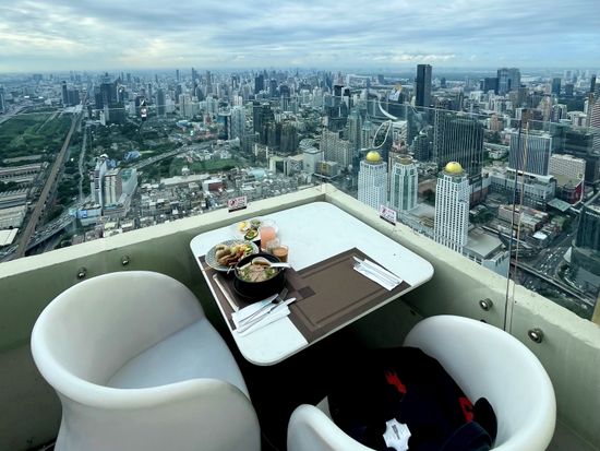 ずっと気になっていたバイヨーク・スカイの朝食ビュッフェに行って来ました。このホテルは300mを超えるバンコクで一番高いホテルとして有名で、朝食会場が81階にあります。絶景を臨むテラス席が結構な座席数があり、SNS映えすることから観光客だけでなく地元のタイ人にも人気です。この朝食の売りは絶景だけでなく、ビュッフェの種類の多さも圧巻です。ブッフェは360度廻れる構造になっていて、その場で料理を作ってくれるライブキッチンがたくさんあります。自分で具材を選んで作ってもらうタイ風ラーメンなどのタイの屋台をイメージしたコーナーが人気です。ブッフェの種類がとにかく多いので、全て制覇することは全く無理でしたが、時間制限は無いので早い時間からゆっくり朝食を楽しみのもいいかもしれません。世界的に見てもここまで高い場所でオープンエアーで朝食を食べられる場所は殆ど無いかと思いますので、是非バンコクでお試しください!