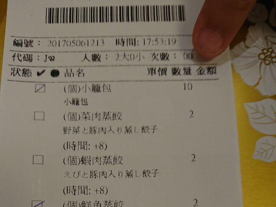 土曜日午後6時の予約でしたが20分ほど早く着いてしまい、その時点で45分待ちと表示され入り口には大勢の人が待っていたので30分は待つなぁと思いました。渡された日本語の番号札には30~40分待ちと印刷されていましたが手書きで10分と書き直され、待つこと5分で呼ばれました。このチケットの威力はすごいです。2階に案内され1階と比べて静かな中で運ばれてくる料理を食べました。味はもちろん、胸に日本の国旗のバッチを付けている方がとても親切にしてくれました。8歳の息子と行ったのですが実は子供は台湾のお茶が苦手。日本でも水が好きなのですが、香港やシンガポールでは水を注文すると¥500は取られましたが、こちらでは「お水をお持ちしましょうか?」とまるで日本のような対応でした。もちろん無料。取り皿を余分にくれたりと子供への気遣いがとても嬉しかったです。