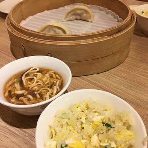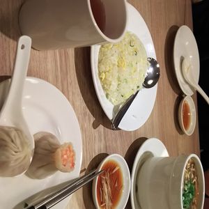 小籠包10個、野菜と豚肉入蒸し餃子2個、えびと豚肉入蒸し餃子2個、えびと豚肉入焼売2個、酸辣湯、空芯菜炒め、卵炒飯、餡入り小龍包2個