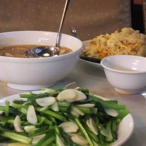 エビシュウマイ、塩味がもう少し欲しかった青菜とニンニクの炒めもの、桜エビのチャーハンは香辛料が私には少しきつめ、酸辣湯と思われるスープは想像通り。デザートは蒸しパンのような可愛らしいもので、もちもちとした弾力でした。店内の客は地元の方より外国人が多いようでした。