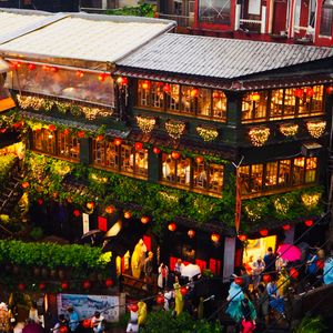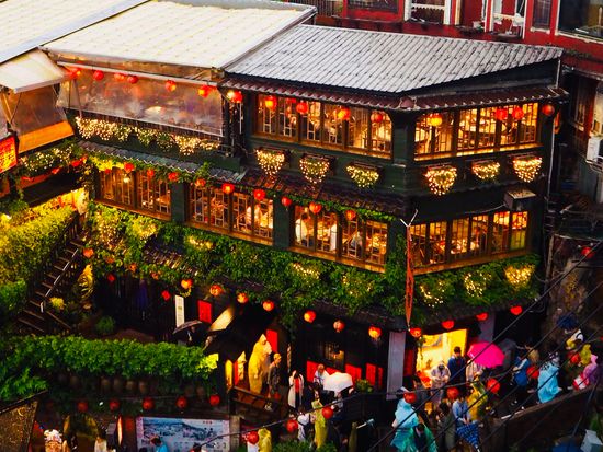 生憎の雨降りで霧がかかり、遠く海の景色は見れませんでした。でも、この「海悦楼」のテラスから真正面に見える、提灯に照らされた九扮のシンボル的な「阿妹茶楼」の姿はしっかりと写真に収めることができました。このレストランに入らなくても、通りからその写真を撮ることができますが、やはりこのレストランの二階、三階からの眺めは更に迫力があり、それだけでも予約した価値があると思いました。雨降りでしたのでベランダ席ではありませんでしたが、「阿妹茶楼」に面したテラスには屋根がついていて、店内利用者は皆さんどなたでもそこへ出て写真を撮ることができます。