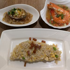 ・空芯菜炒め・ポークリブ・フィッシュアモック・チキンとピーマン炒め・卵と玉ねぎの炒め・ジャスミンライス・季節のフルーツとあり、てっきりコース料理かとワクワクしますが、実際にはフィッシュアモックと空芯菜炒め のみ。さっぱりしているのでお腹が空きます。