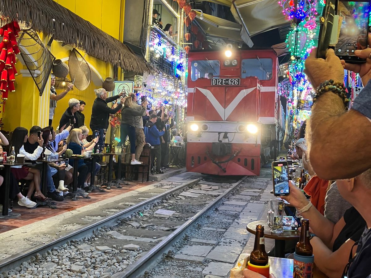 帰りが市内で渋滞しても、運転手さんが効率よく進んでくれ、トレインストリートの19:15列車通過に余裕を持って到着、ここで解散です。線路際のカフェでギリギリを列車が通るのは、ハロン湾に匹敵する経験でした。