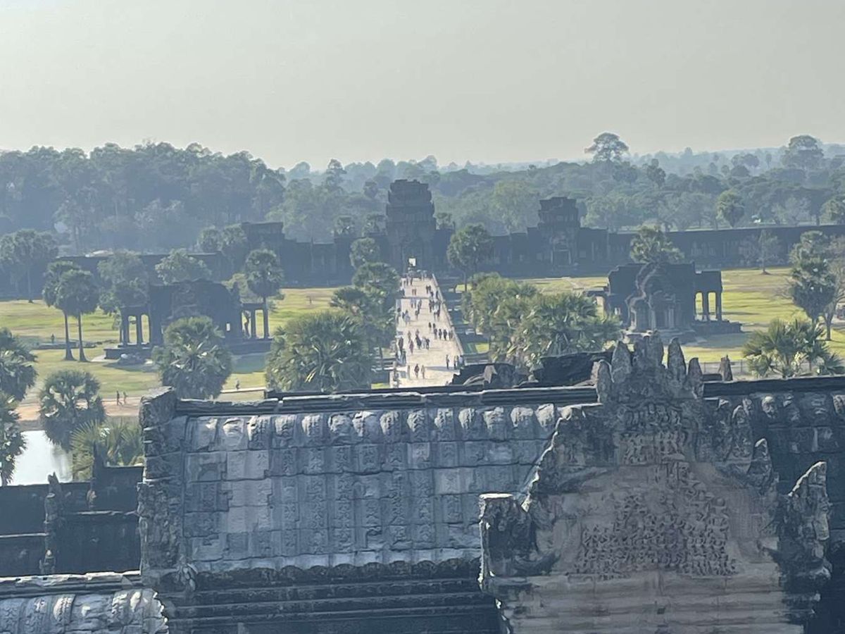 アンコールワットの高台から見下ろした壮大な景色。一直線に続く参道が、神聖な寺院へと導くかのように伸びています。緑豊かな風景と遺跡が調和し、時を超えた神秘的な雰囲気を醸し出しています。