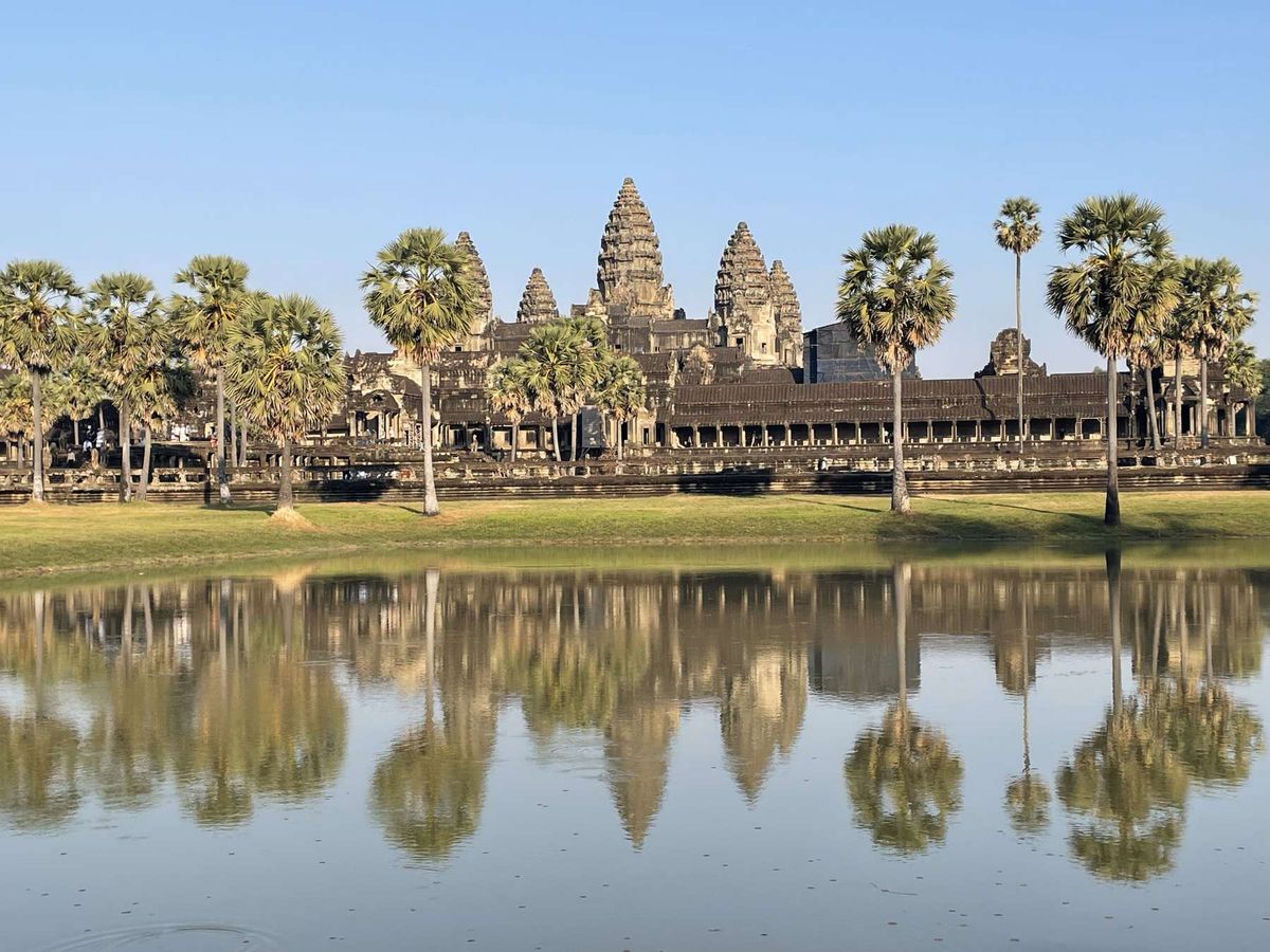 水面に映るアンコールワットの幻想的な風景。5つの塔が美しくそびえ立ち、青空とヤシの木が調和した壮観な光景が広がります。