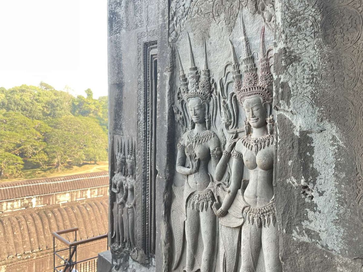 アンコールワットの石壁に刻まれた、美しいデバダー(天女)の彫刻。細やかな装飾や表情の繊細さが、クメール王朝の芸術の高さを物語っています。長い年月を経ても、その優雅さは色褪せることなく、訪れる人々を魅了します。