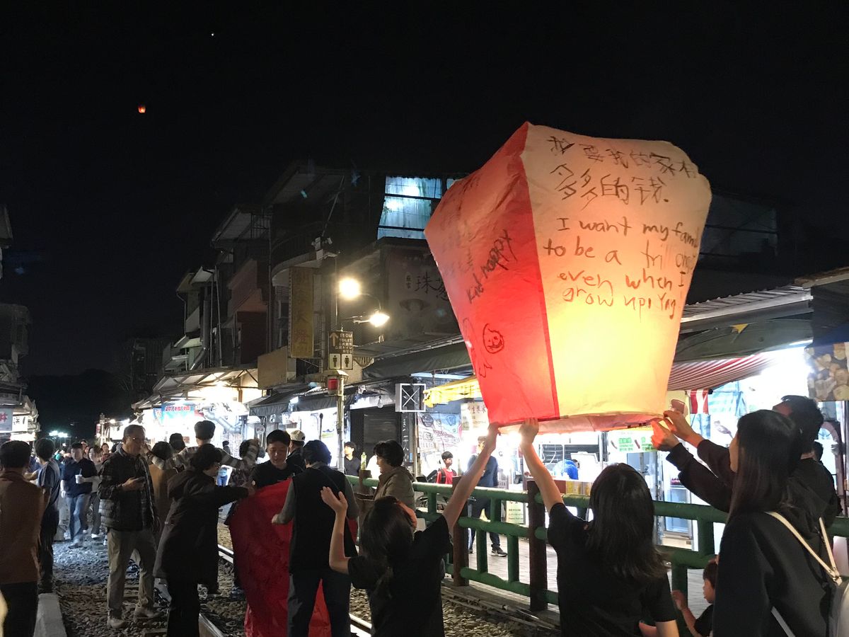 初台北ならこのツアーは外せません。いつも混んでると思うけど、バス2台を逆回りにして私たちは十分のランタン上げを先に。待ち時間もなく次々と自分たちのランタンを上げ(ちゃんと写真も撮ってくれ)ました。