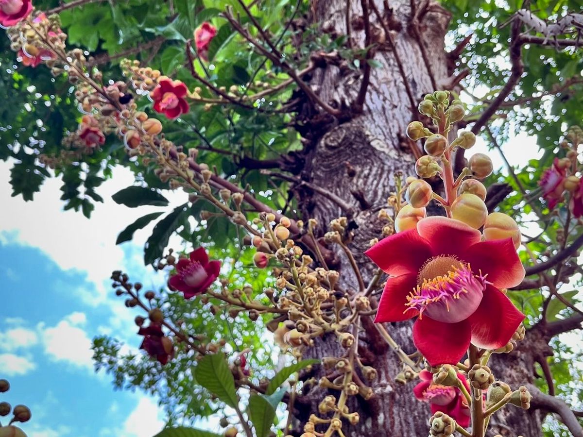 お寺の庭の大きな木々に咲いていた色鮮やかな花とともに、印象深い時間でした。ガイドさんに心から感謝です。