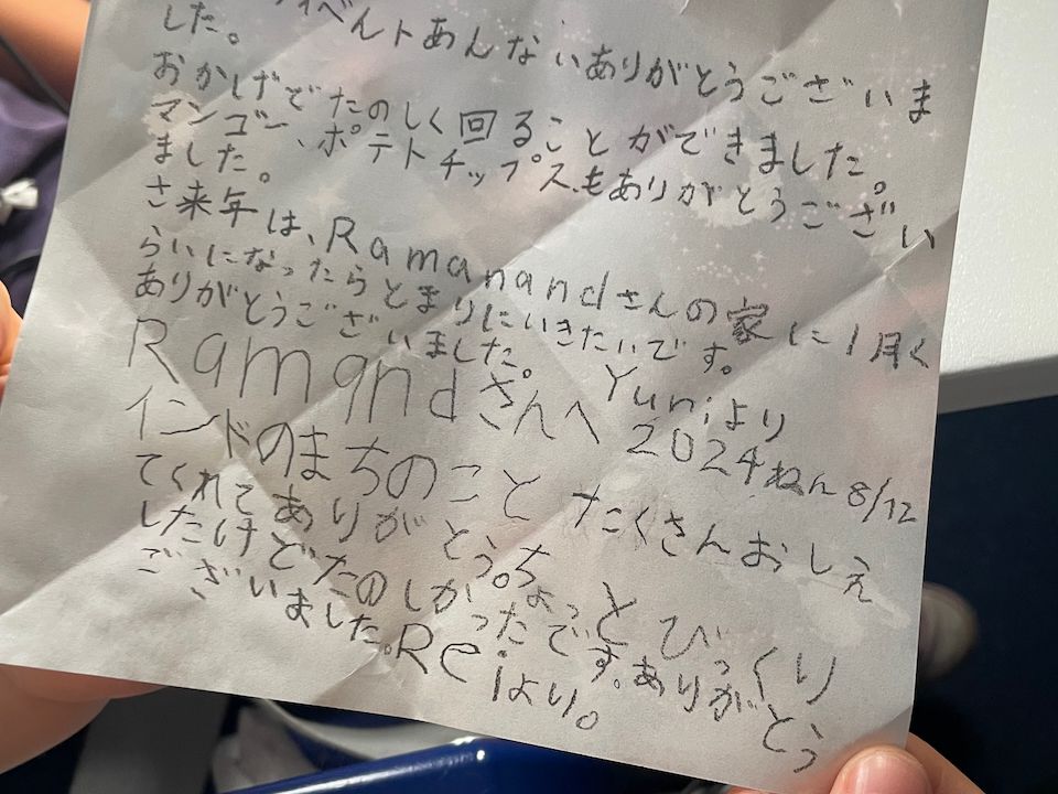 また何気ない移動中の会話を覚えていて、娘たちがマンゴーが好きだと聞くと、車を停めて道端の果物屋さんのマンゴーを買ってきて、その後のランチのレストランにお願いしてそれを出してくれたり。しょっぱいお菓子が好きだと聞くと、帰りの飛行機の中で食べてねとインドのポテチをいくつも買ってプレゼントにしてくれたり。行程を終えての最後のお別れでは二人の娘は泣いてしまうくらい、Ramanandさんにはお世話になりました。