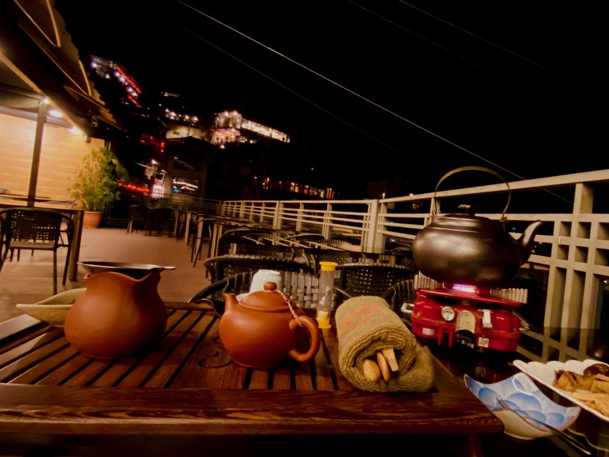 夕飯を食べた後、古窓レストランのレジに行くと、お店のスタッフの方が「これぞ九份!」というようなイメージのテラス席に案内してくれて、ツアーに含まれているティータイムをしました。普通のツアーが来ない時間なのでテラス席は貸し切りで、最高のティータイムでした。
