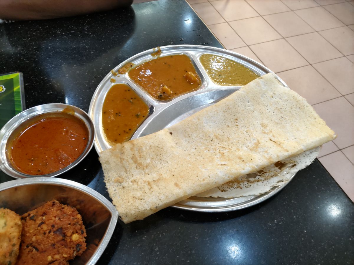 そして、Vinny Jeyaa という南インドレストランでカレーとThosai(クレープ生地みたいな)をいただきました。さっぱりした味で美味い。典型的な南インドでの朝食スタイルだそうです。南インドではナン(naan)は食べないとも言っていました。