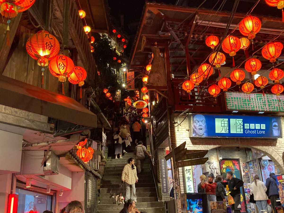 九份では食べ歩きしたり、お土産を買ったり、写真スポットで写真を撮ったりしました!日本人ばかりで、お互いに写真を撮りあうこともできるほど安心感がありました。19時ごろはとくに人が多く、階段を降りる列が全く進まないなどがあるので、周りに気をつけながら進むのがおすすめです。