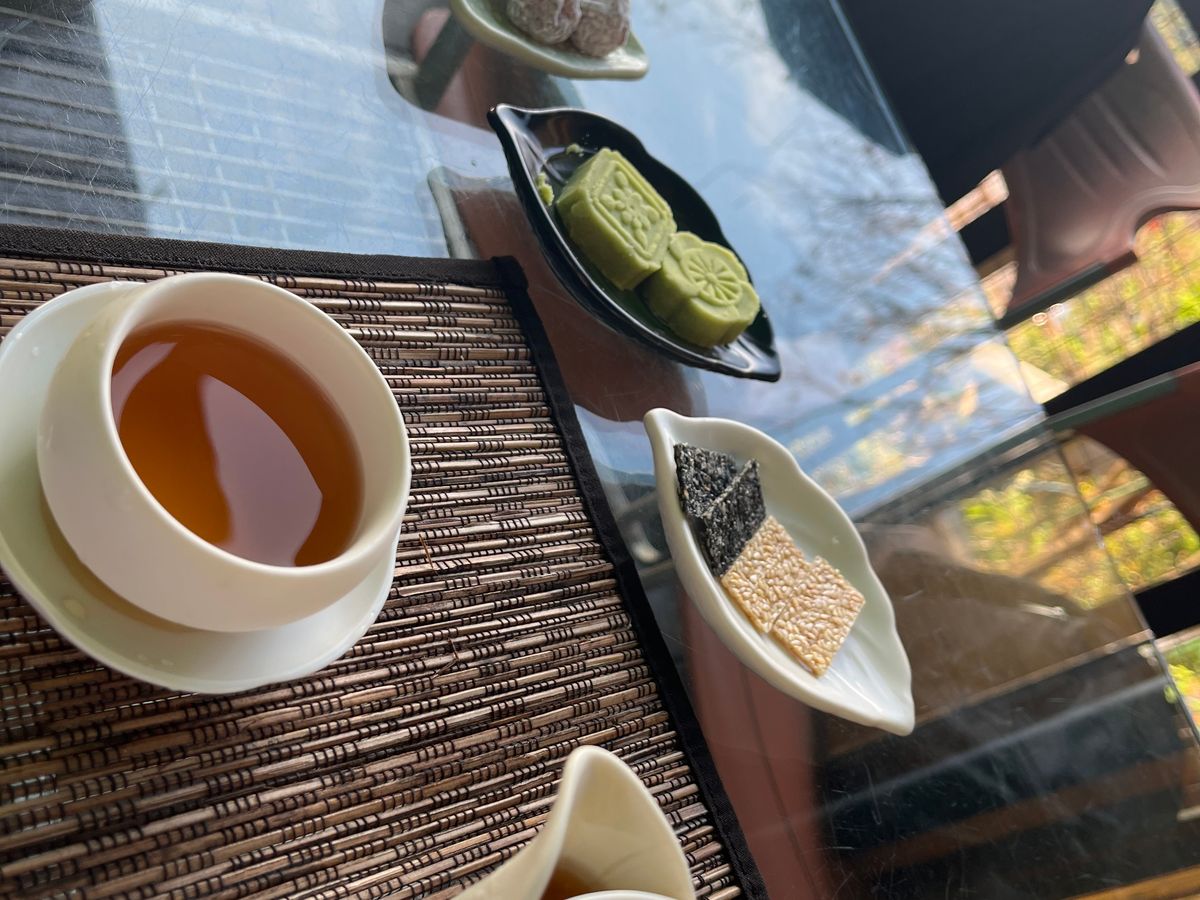 日が沈んでいく夕暮れの九份は幻想的な風景で、素敵な茶芸館でお茶の体験もできました。