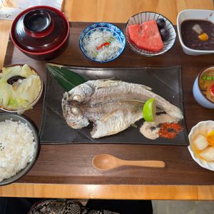お昼ご飯食べたお店は定食があり、メインの魚とその大きさを選び、その調理方法も選びます。「焼く」「煮る」「蒸す」の中から好きなものを選びますが、その魚の種類や大きさによりおすすめをお店の方が教えてくれました。私は「のどぐろ」(現地の表記では「黒喉」)を選びましたがサイドのものも含めて美味しかったです。