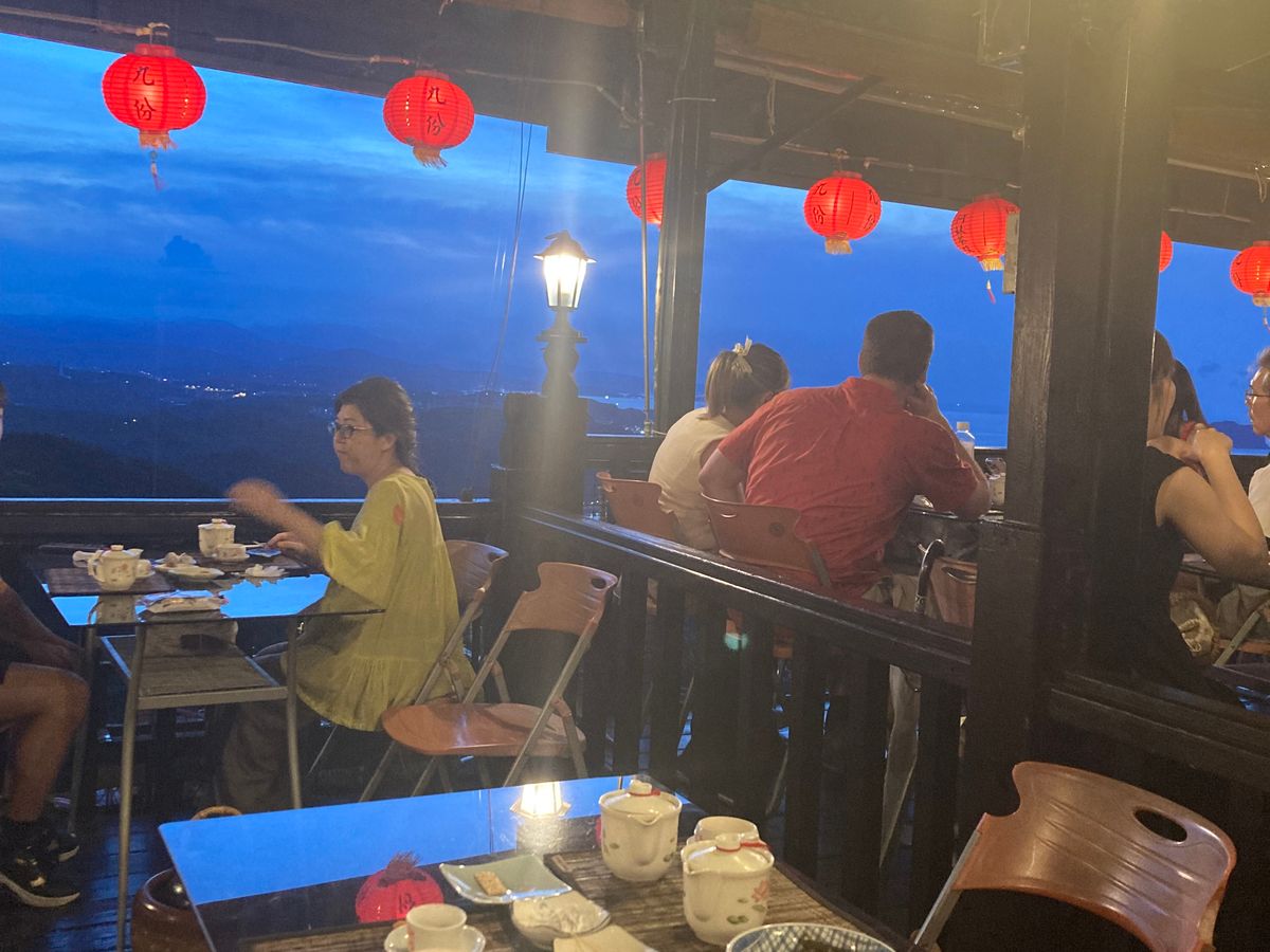 階段が多いと聞いていたので、ツアーに申し込むかどうか少し迷っていました。でも、行ってみて大正解。そろそろ疲れるかなぁという頃には、ガイドのアッピンさんお薦めの阿妹茶楼に到着、アドバイス通りすぐに入店し、結果、お茶とお菓子を頂きながらゆっくり景色を楽しむ事ができました。丁度陽が沈み始める夕暮れ時から暗くなる夜へと変わる時間帯で、ベストタイミングだと思います。お店を出る頃には夜空に綺麗な三日月が…。夜風も心地よく忘れられない旅の1ページとなりました。自分は食事なしのコースでしたが、バス同席の方のお話では、あまり期待していなかった食事も美味しかったと喜んでいらっしゃいました。