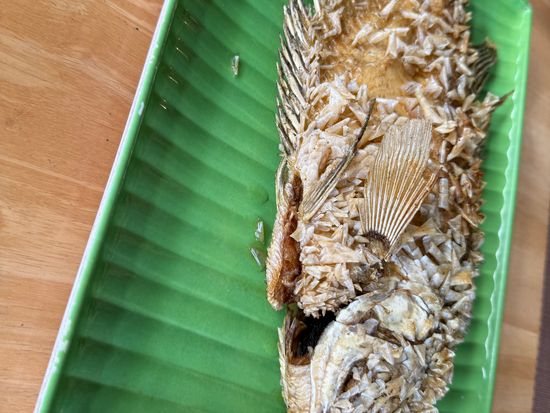 After kayaking up and down the river in the morning, we headed straight to a place called Family Tiny Garden for lunch. We got to make bánh xèo (something like Japanese okonomiyaki) ourselves, and eating it fresh on the spot was absolutely fantastic. We were completely full after dishes like deep-fried elephant ear fish and shrimp BBQ.