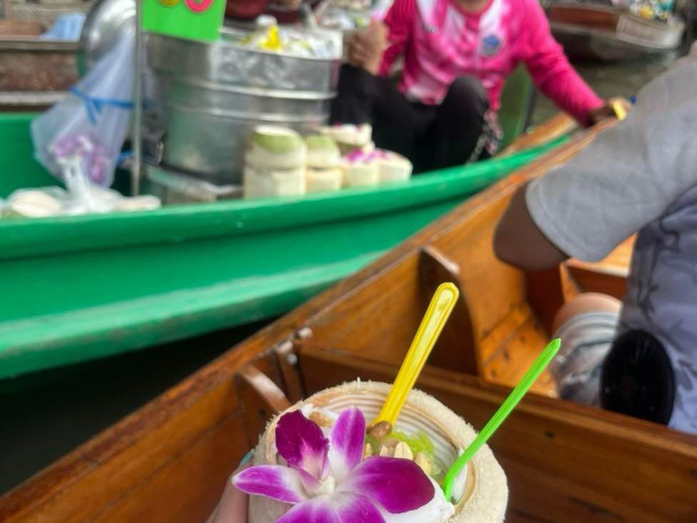 水上マーケットを選択しましたが、想像する水上マーケットではなかったです。簡易的な船で川を往復し(10分ほど)、マーケットは川沿いにあるので、船に乗った後に立ち寄る形でした。