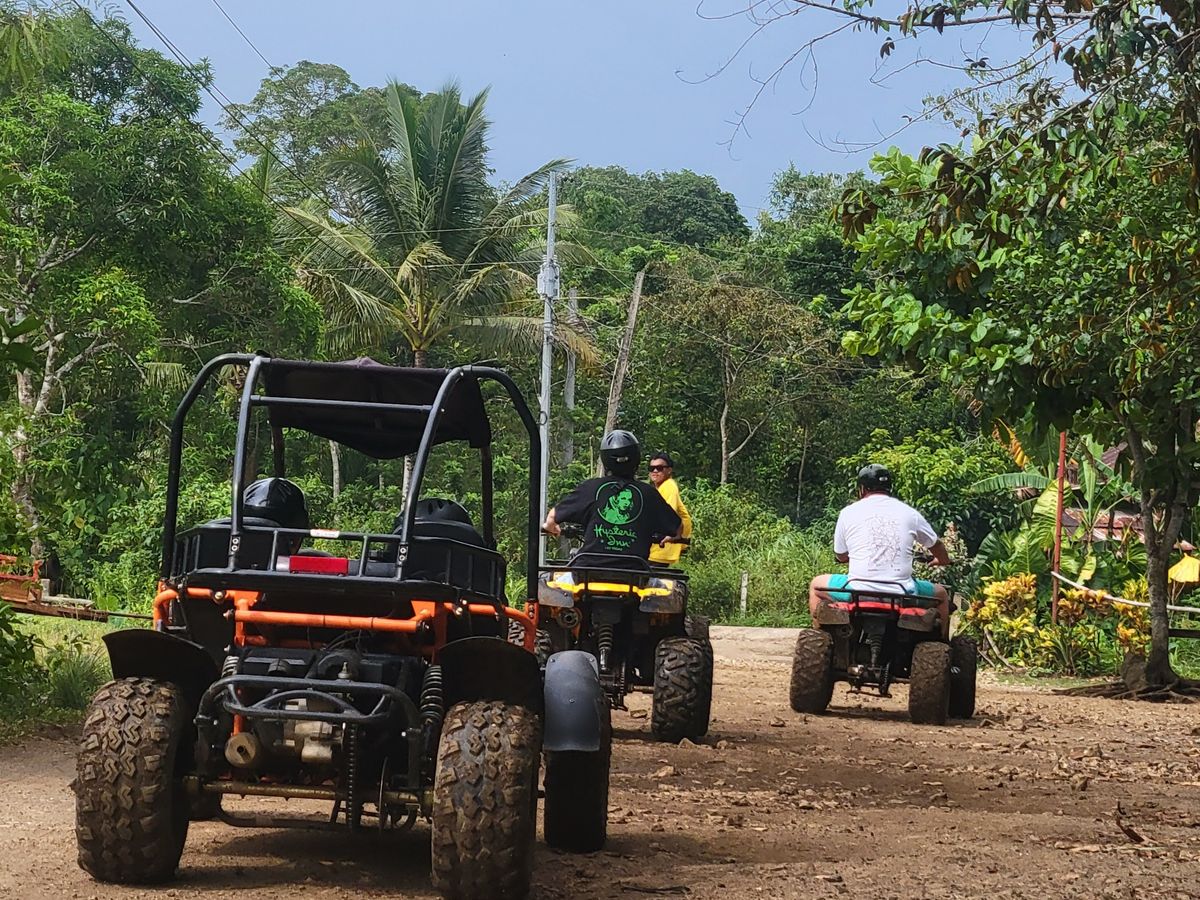 二人乗りバギーの運転は車と同じ、写真は小学生が運転しています。わざと泥水に入り大騒ぎ、終わったときには全身どろだらけ。川のクルージングでのシーフード昼食は満腹。ターシャは触れませんでしたが近くでみることができました。楽しめるツワー。