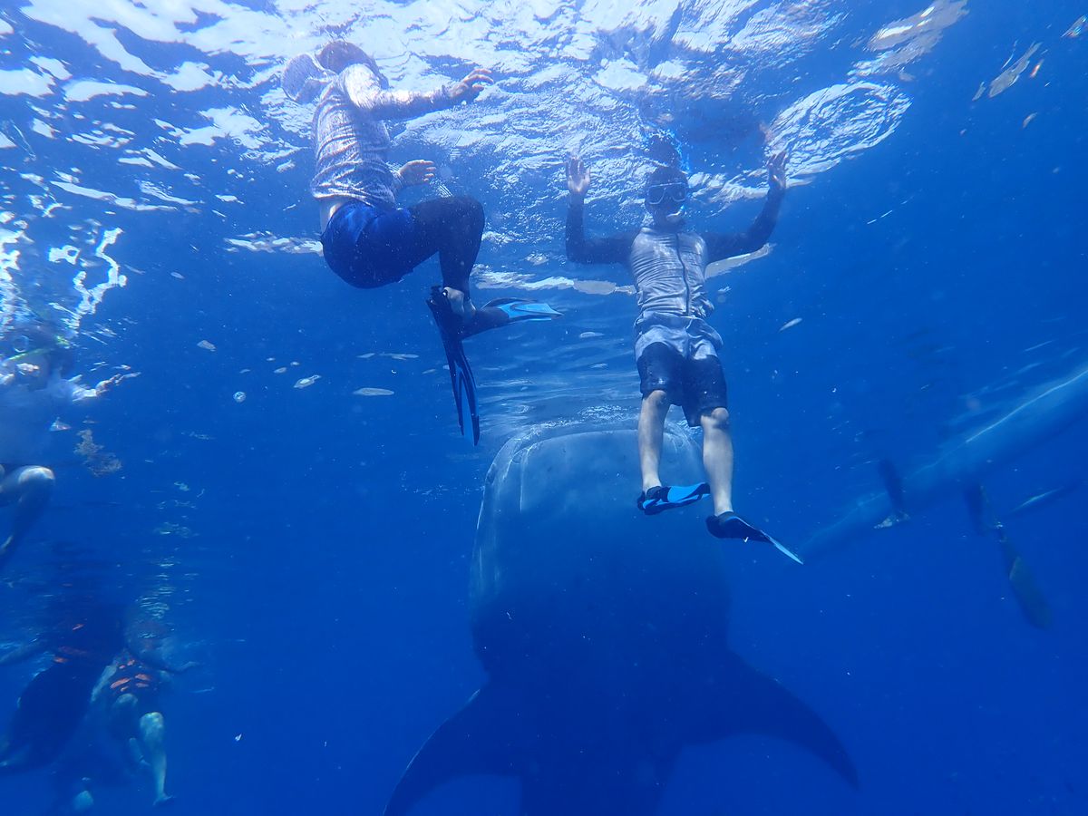 そこから、ジンベイザメがいる海へと。浜辺から100mぐらいの所で、ジンベイザメがたくさんいてびっくりしました。凄い近い所でシュノーケリングしながら、10頭以上のジンベイザメと泳ぎます。本当に大きくて近過ぎてびっくりです。感動しました!