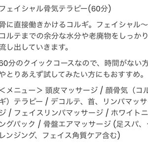 | プラン: | 【2人目無料!】人数限定モニター/美白リフトアップ+コルギコース(70分) |