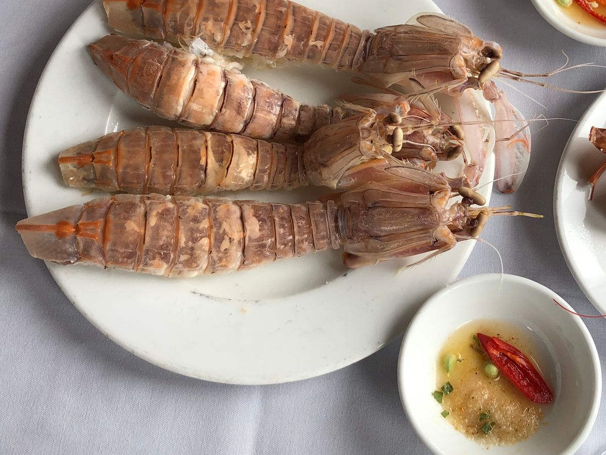 3時間位で現地に到着し、凄い人混みの中船に乗り込みすぐ食事がはこばれてきます。せっかくなので、二人で50ドルのランチアップグレードをオプションで頼んだのですが、一人シャコ2匹と蒸した蟹一匹です。通常メニューにある蟹の甲羅にグラタンを詰めた食べ物はランチアップグレードしたら食べれません。