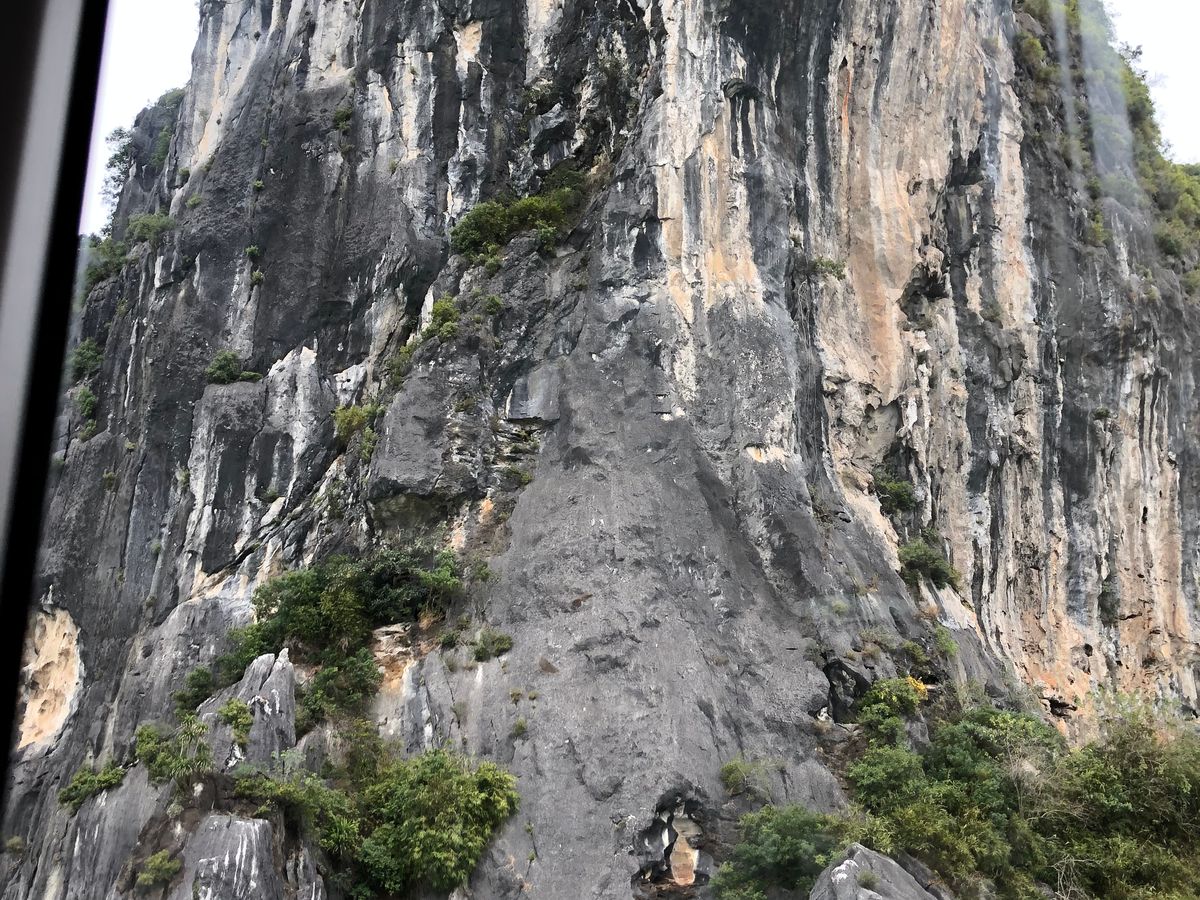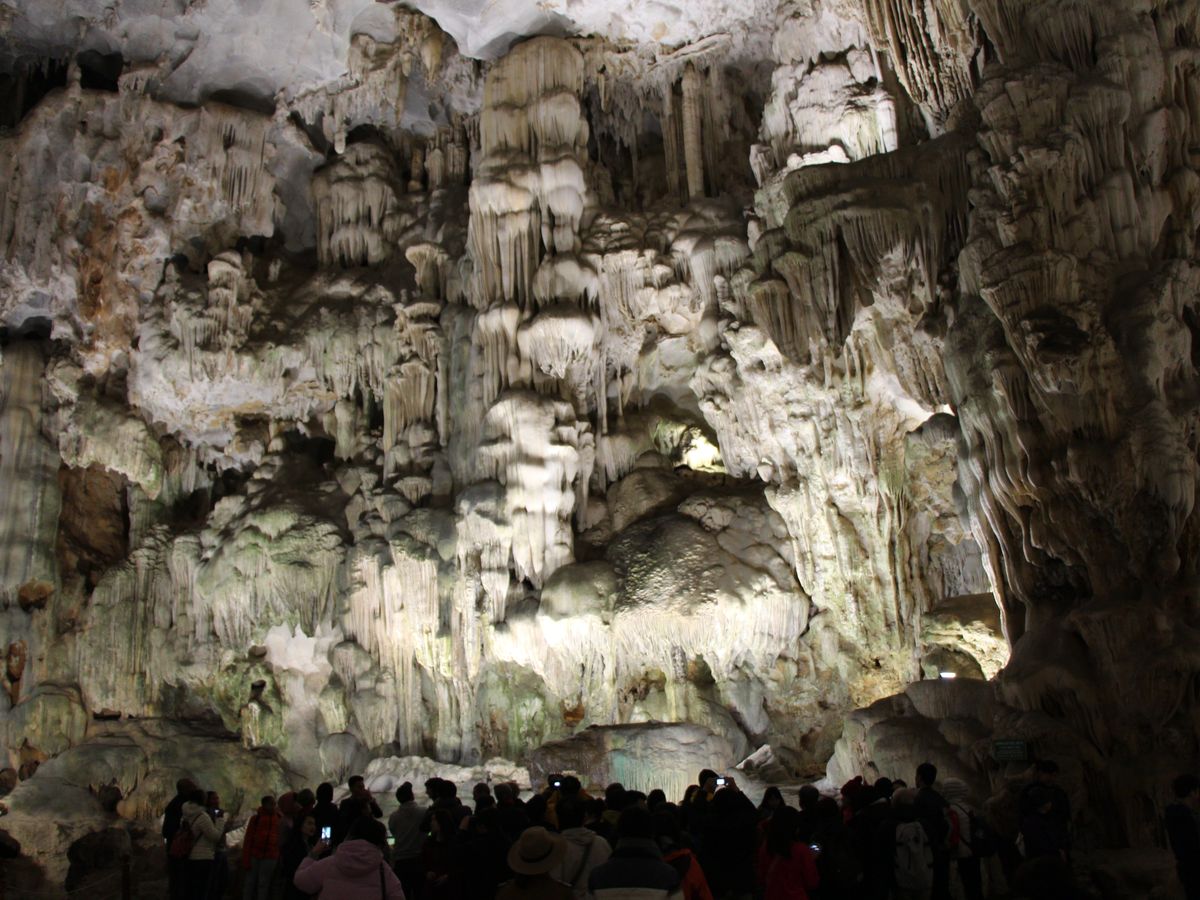 ハロン湾は翡翠色と言われる水と見事な奇岩が連なる景勝地ではありますが、当日は曇りで風が強く残念ながらゆっくり景色を楽しむという感じではありませんでした。それでも雄大な景色は一見の価値ありだと思います(晴れていればなお良し)。一方、鍾乳洞は当然ですが風もないため、ゆっくりと楽しむことができました。中は高さ20~25メートル程度でしょうか、鍾乳石が天井から垂れており(つららのようです)、LED照明のライトアップでとても美しく演出されています。